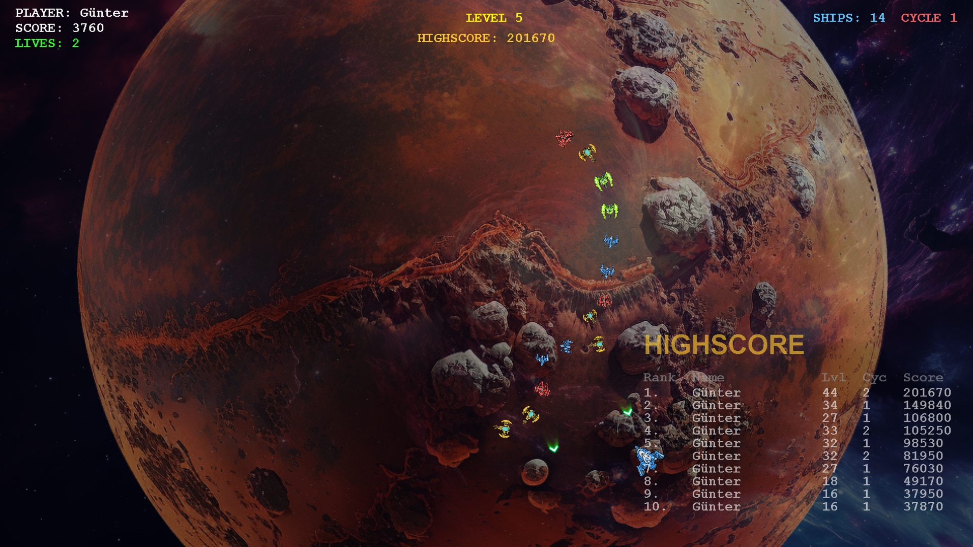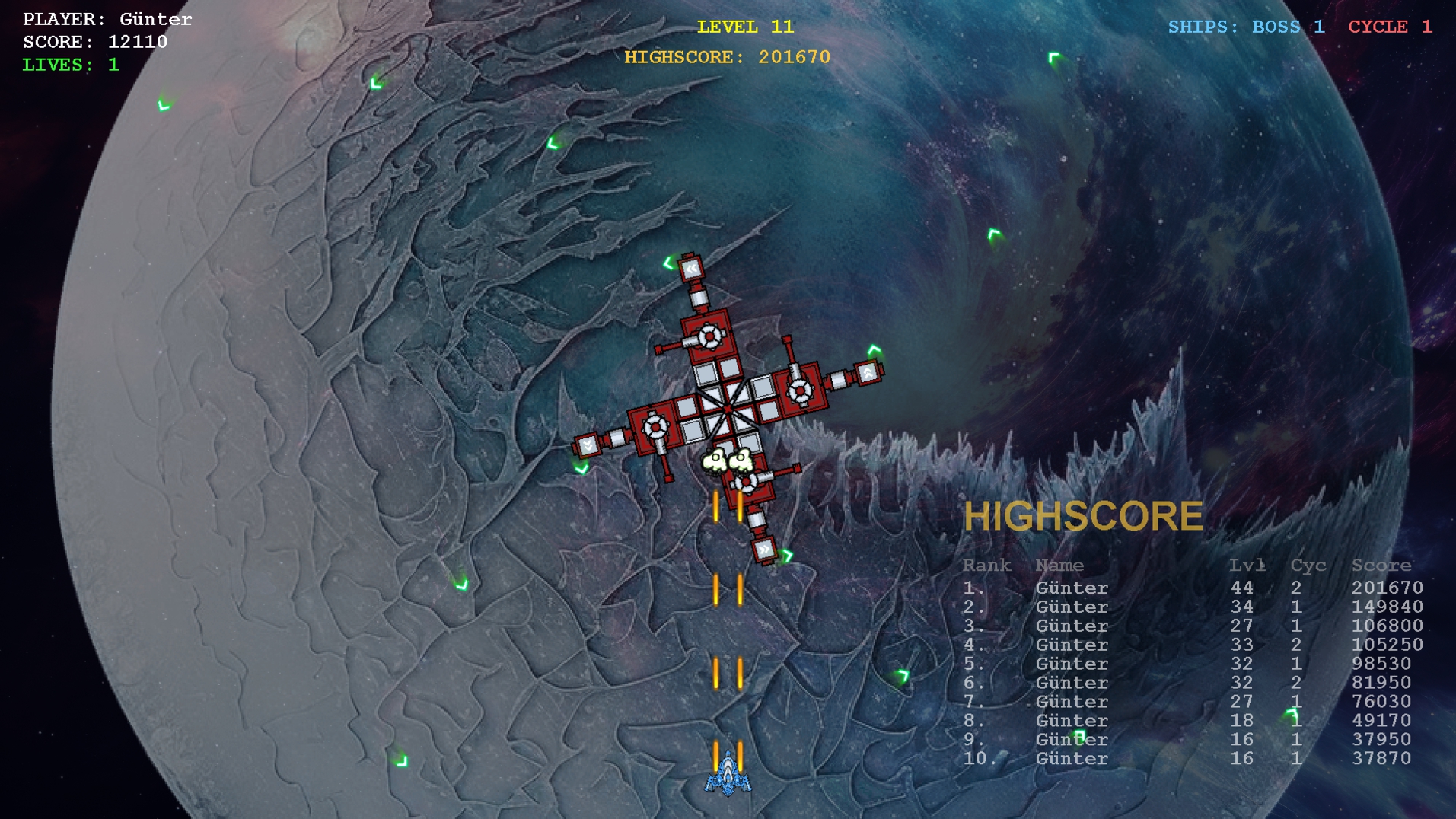 Another Gyrus is a classic shoot-’em-up game, inspired by the classic games of the 80s. Controls: keyboard, arrow keys, space bar, P to pause.